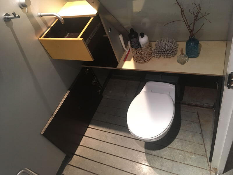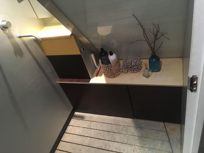 Other side of room will be white phenolic ply seat and basin, the under stair portion will lift to reveal the loo. Walls are silver anodized aluminium, slots in the floor are tapered to allow water drainage.