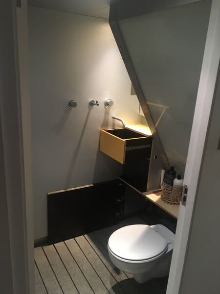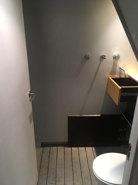 Tightest space in the house steals what light it can through the opaque muslin glass hovering under the floating treads of the staircase. The toilet pan folds away and mirrors enlarge as much they can the storage options with a wash hand basin hiding in a draw to save on further room cramping.