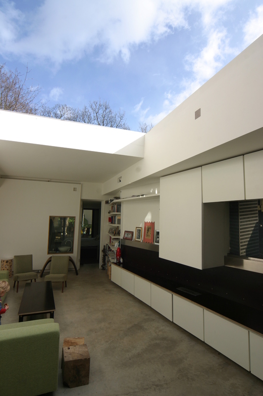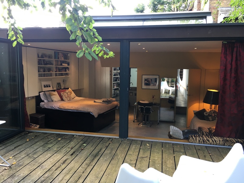 With the double doors it also could be a garage, a workshop, a photographers studio or a store room. The room is built as a ‘lean to’ and thus is a very lightweight structure sitting on 2 columns, this meant virtually no foundations are required which would interfere with the roots of the Plane tree. It also allows the Willow hedge to grow with little concern since the structure can ‘move’ with it.