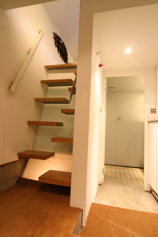 The staircase up to mezzanine 1 is designed to give the illusion of floating (a sailing theme resounds throughout the house) and can be walked up normally. ‘Over stepping’ like John Wayne is entirely unnecessary.