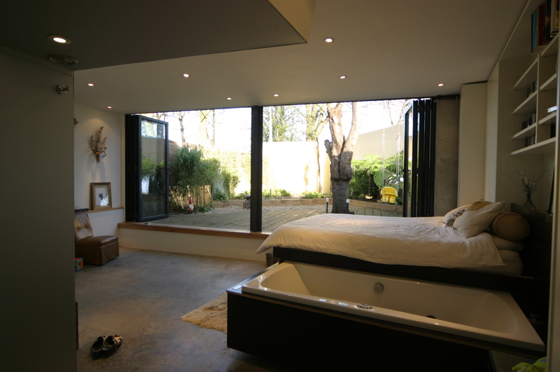 The step up to the garden was a result of keeping roof lines down for planning but also to help bring the garden ‘in’ to the room. With the glazing fully open the bed feels like it is in the garden.